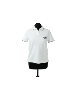Women's CHRISTIAN DIOR white cotton polo T-shirt. Features a navy blue embroidered lucky star and the "CHRISTIAN DIOR" signature on the chest.
